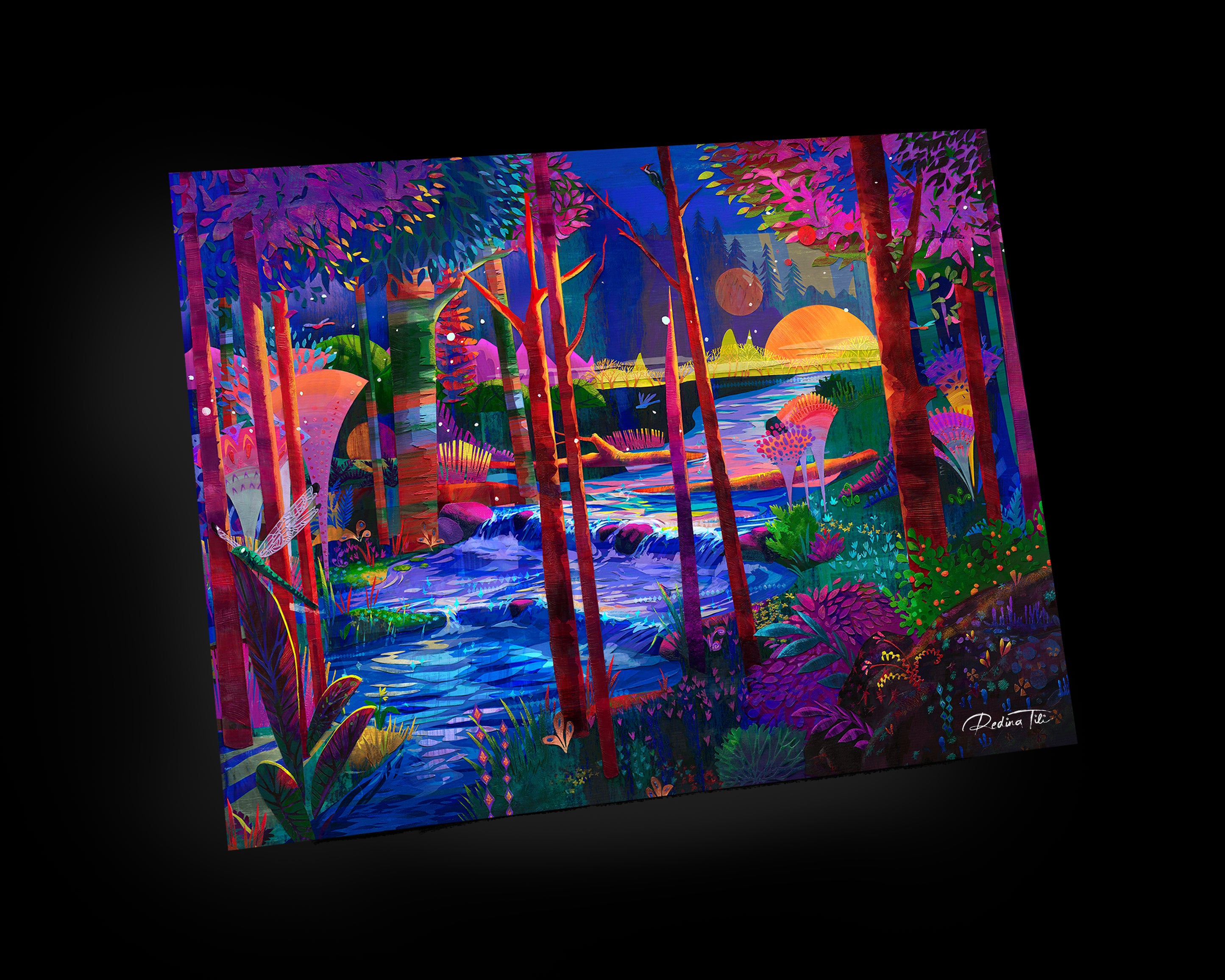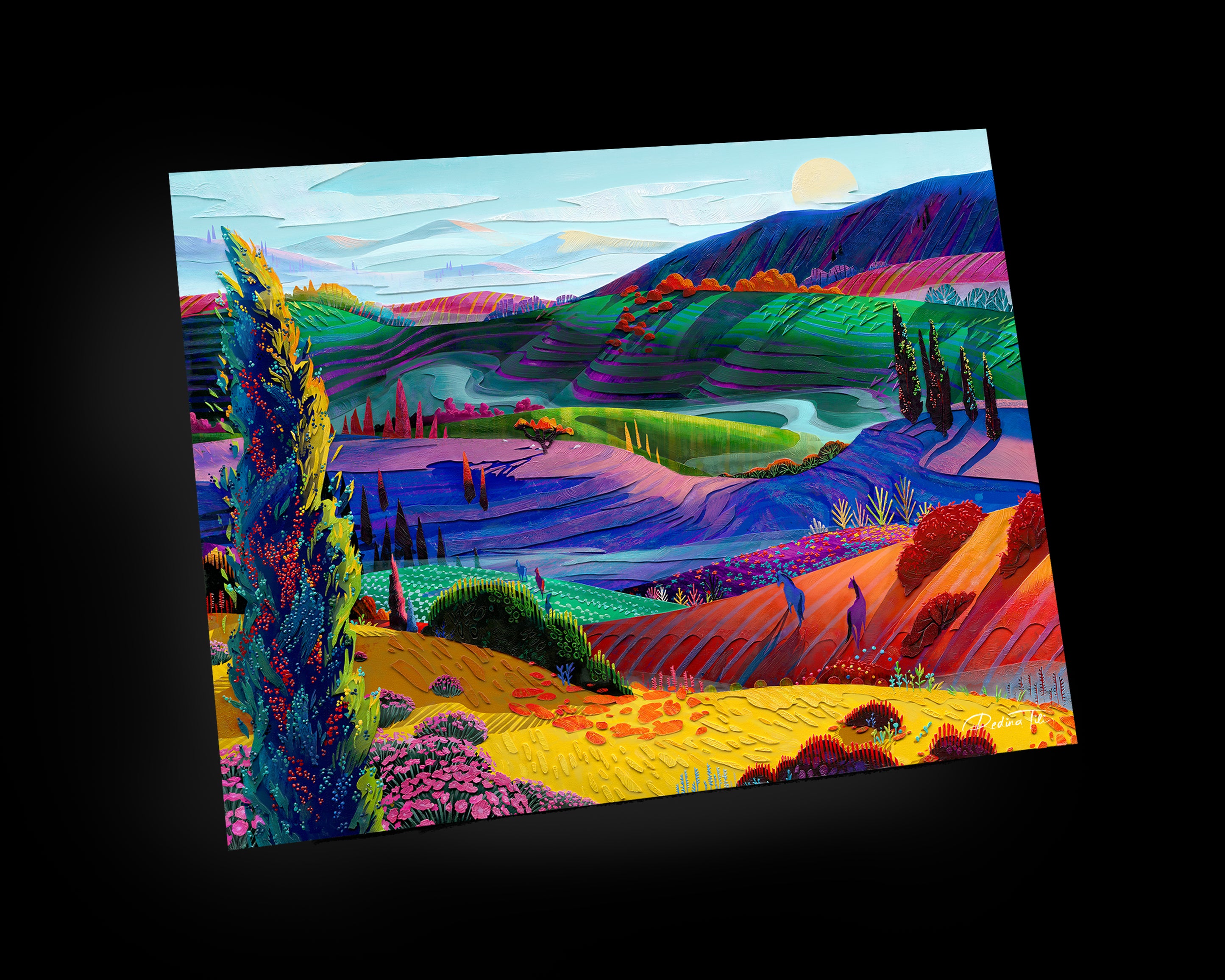 Redina's Art Prints are produced with the best technology and materials for the immaculate display of a modern look, durability, detail and color accuracy. They come in multiple sizes to provide a perfect fit for any space in your home or office. The clarity and depth of brushwork and sculpted shapes of these paintings will draw you inside the unique journey through Redina's magical, colorful world.