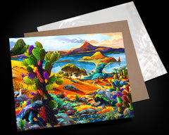 Born of fire, the Galapagos volcanic islands are a living museum that shelters the most unusual iconic creatures in this art print on cardstock paper.  There is a diversity of plants and animals with an ancient history and beauty found nowhere else in the world. Your eyes wander with amusement, jumping from the intriguing marine iguanas, to the 100-year-old gentle giant tortoises, from the tropical penguins to the colorful booby sea birds. Under the breathtaking sunrises and sunsets, the wildlife roams free and unafraid in this small piece of paradise.