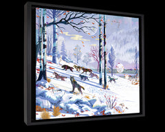 On a silent winter day, a fresh coat of snow is gently covering the old one. As you stare at the white endless horizon, time has almost stopped. In this framed art print on canvas, a pack of wolves chase the scent of prey up the hill, while the hypnotizing eyes of the Alpha are looking straight at you... It's a life changing scene imprinted on your mind, one that you will remember forever.
