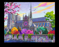 Our landmarks are a part of our landscape and history, and I always admired the masterful, incredible details on Notre-Dame. It was sad to see it burn in flames five years ago, and that's when I decided to create this painting. As artists we possess powerful tools that can revive and preserve lost visions. Through this limited edition print on canvas of Notre-Dame de Paris, I wanted to rebuild its majestic beauty surrounded by the vibrant colors of spring, for everyone to enjoy.